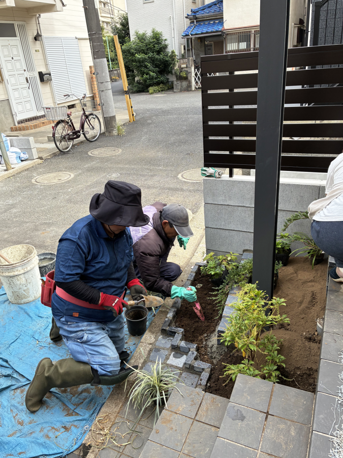 いつもお世話になっている秋津園芸さんと、あいばこの新スタッフ、お庭大好き山田さんにも助っ人に加わりどんどん進めていきます。