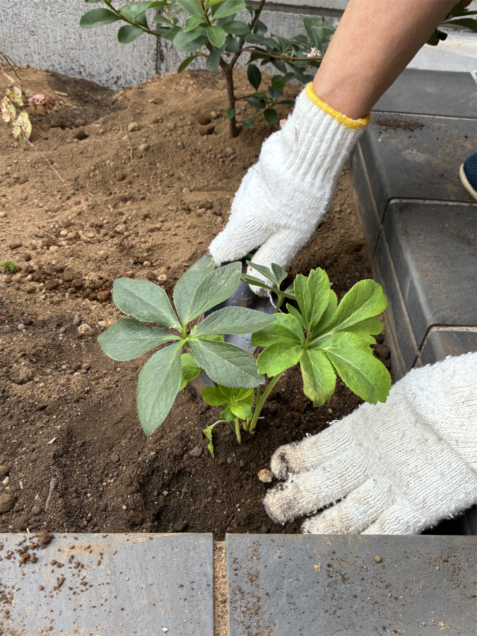 ここにはこれかな、小さな木も入ったほうが良さそうですね、など事前にご希望いただいていた植物に+現場で検討しながら配置して植えていきます。