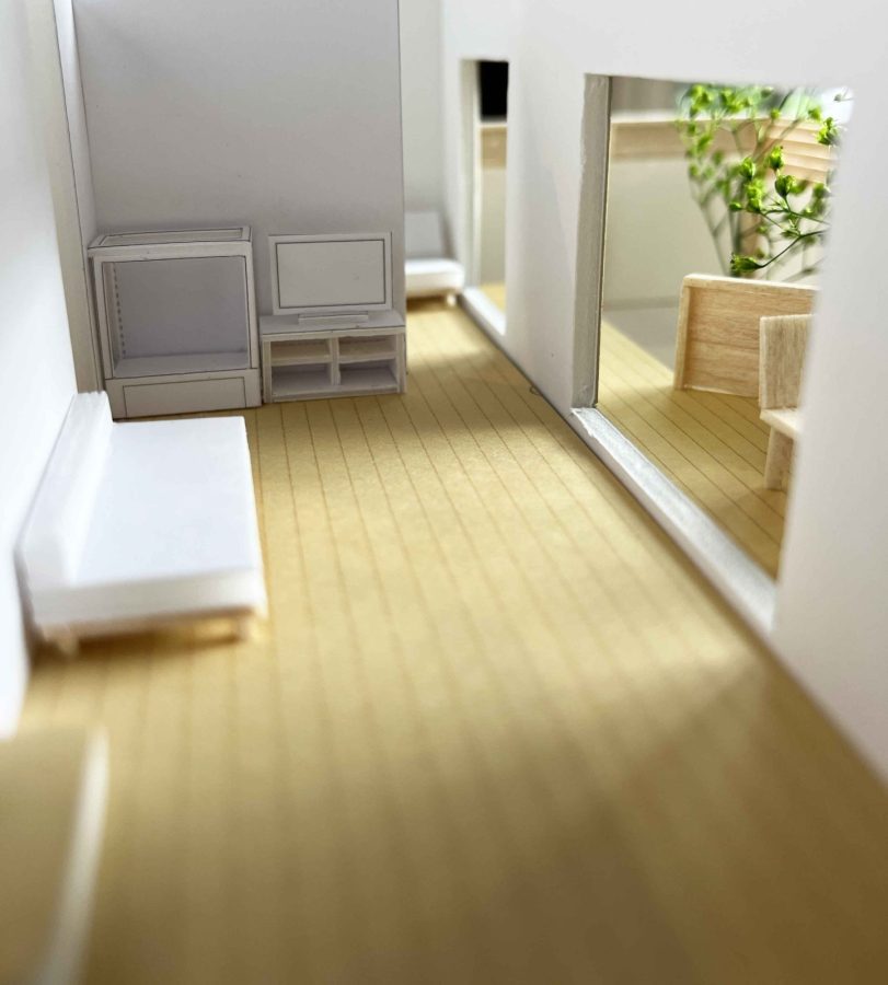ダイニングキッチン、リビング、寝室を南側に長く配置して束西方向の端から端まで視線が通るようにすることで、最大限開放感が得られるような計画となっています。