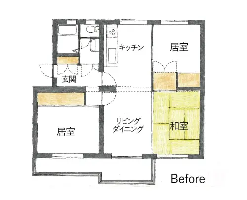 幹線道路沿いの緑豊かな敷地を入った先、建物が建ち並ぶ団地の一室をリノベーションしました。元々奥様のご実家であり、お父様がお住まいだったこの部屋に、昨年9月からお二人で住まわれています。